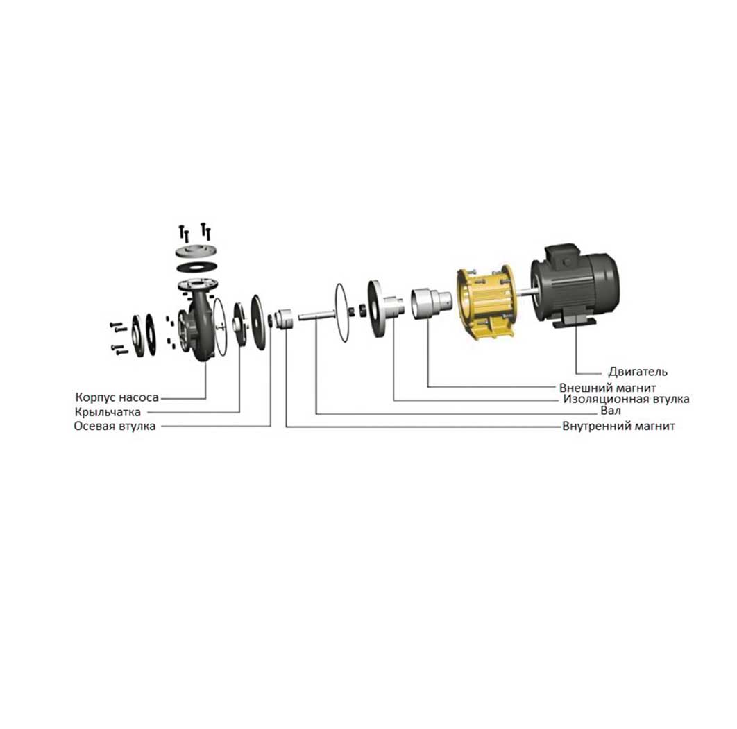 Магнитная муфта состоит из двух магнитных колец - внешнего и внутреннего. Внешнее магнитное кольцо соединено с двигателем, а внутреннее либо непосредственно, либо через промежуточные элементы соединяется с рабочим колесом. Между внешним и внутренним кольцами располагается неподвижная защитная оболочка, обеспечивающая герметичность концевого участка вала. В покое малые магниты внешнего магнитного кольца располагаются напротив противоположно ориентированным им малым магнитам внутреннего магнитного кольца. При сообщении двигателем внешнему магнитному кольцу крутящего момента внешние малые магниты начинают отклоняться от своих противоположно ориентированных пар. Под воздействием притяжения и отталкивания между магнитами крутящий момент передается от внешнего кольца внутреннему.